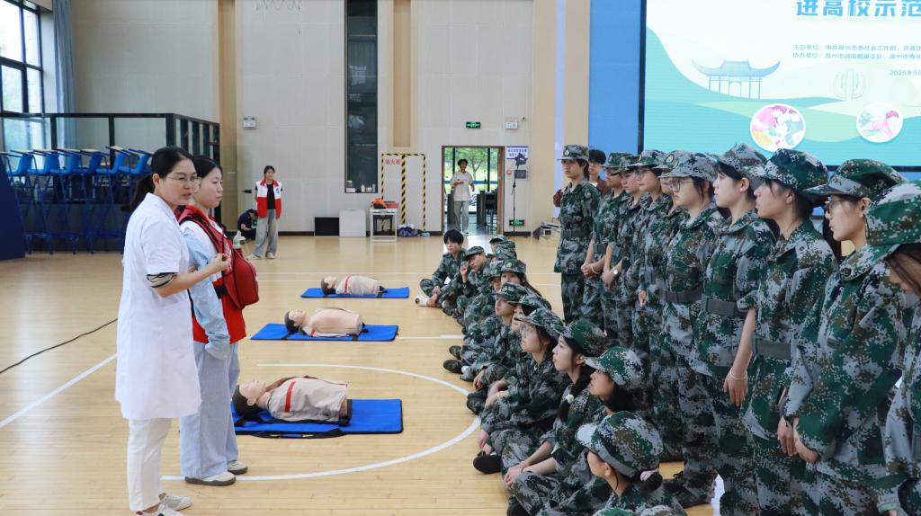 我校教师谢路路、沐菊、吕婷婷与滁州市青年志愿者协会吴葛峰演示心肺复苏(CPR)和海姆立克急救法,现场邀请青年学生实际操作,学习如何在黄金4分钟内挽救生命。