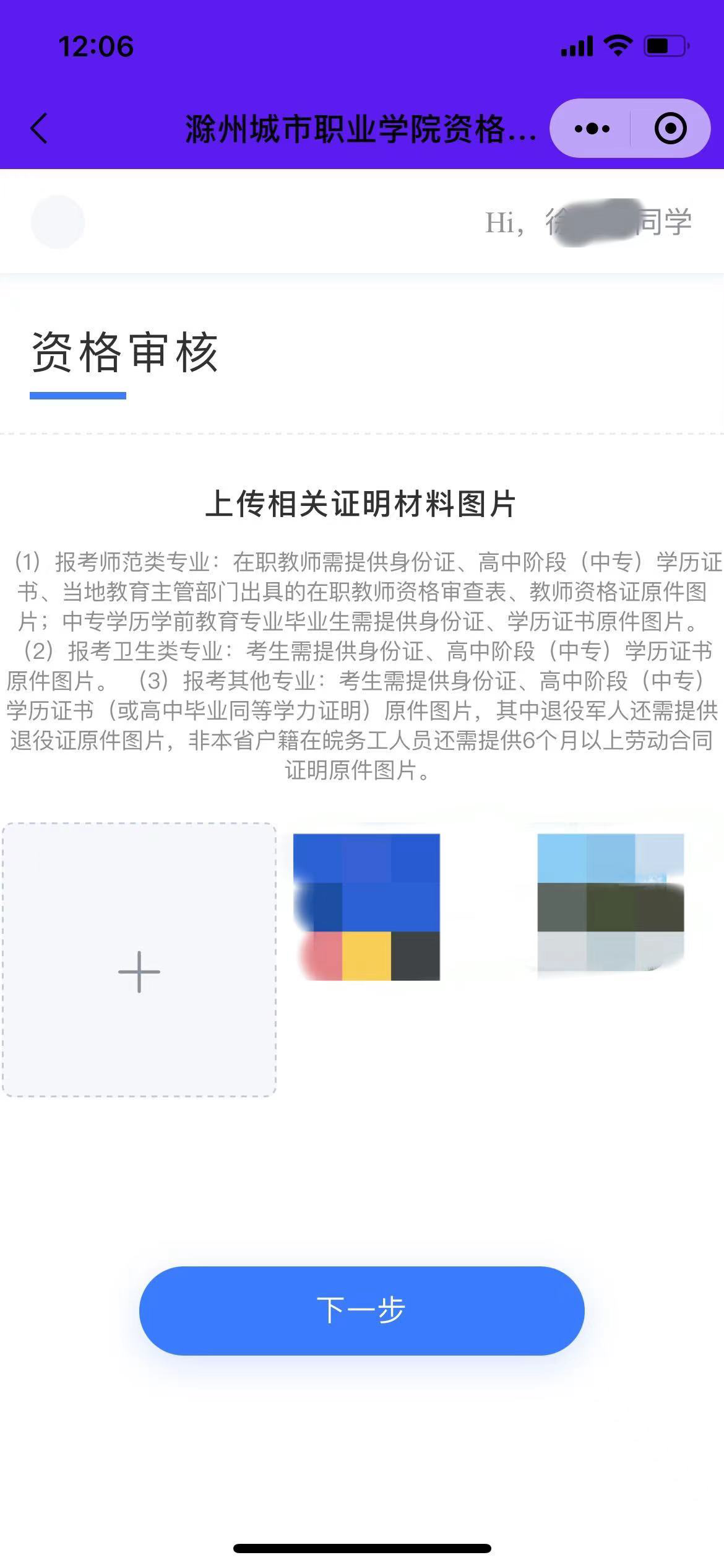 六、点击“+”号进行上传资料,上传完成继续点击下一步。